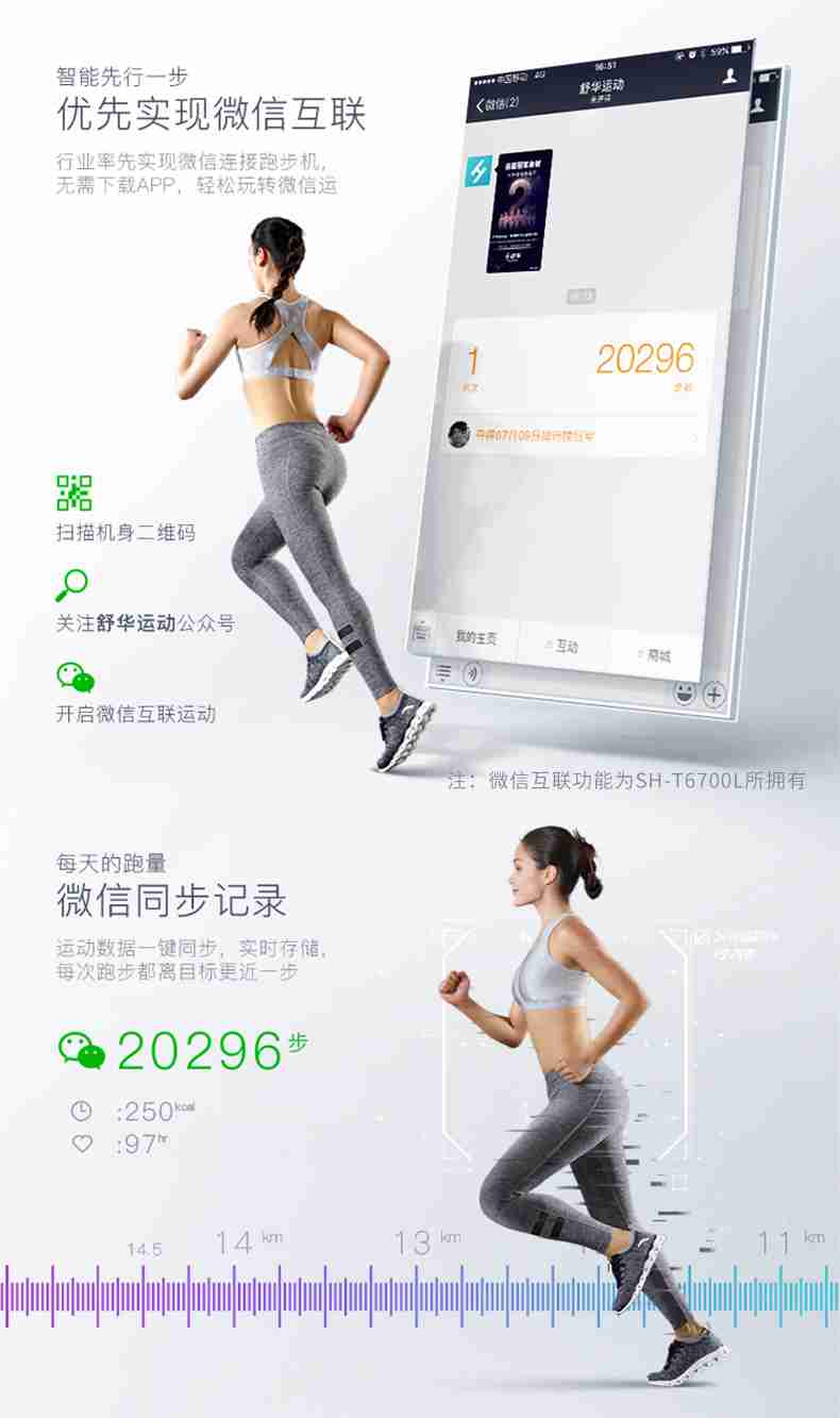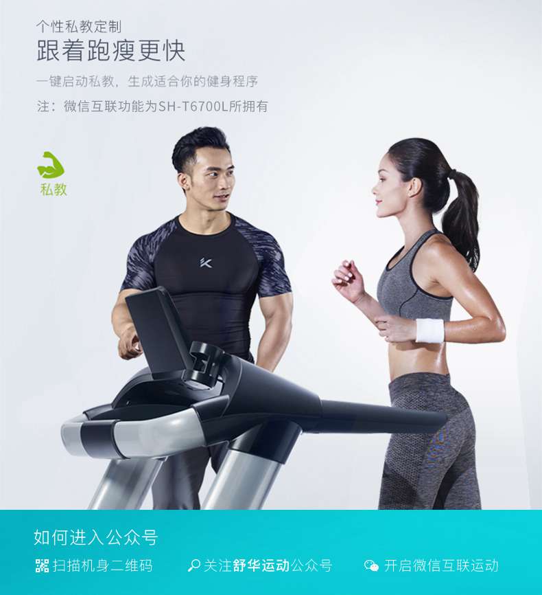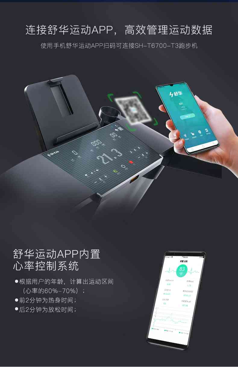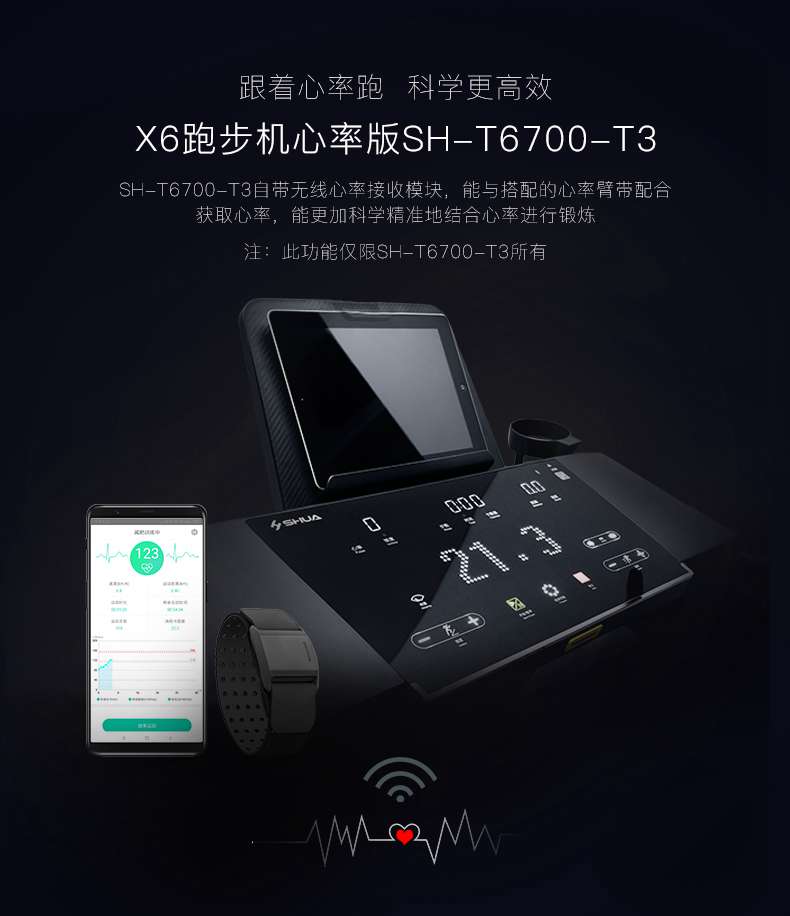 SH-T6700-T3跑步机为了帮助用户进行更加科学有效的运动,搭载jiuyou.comAPP连接心率臂带实现心率控制,通过监测运动心率从而实现科学运动。