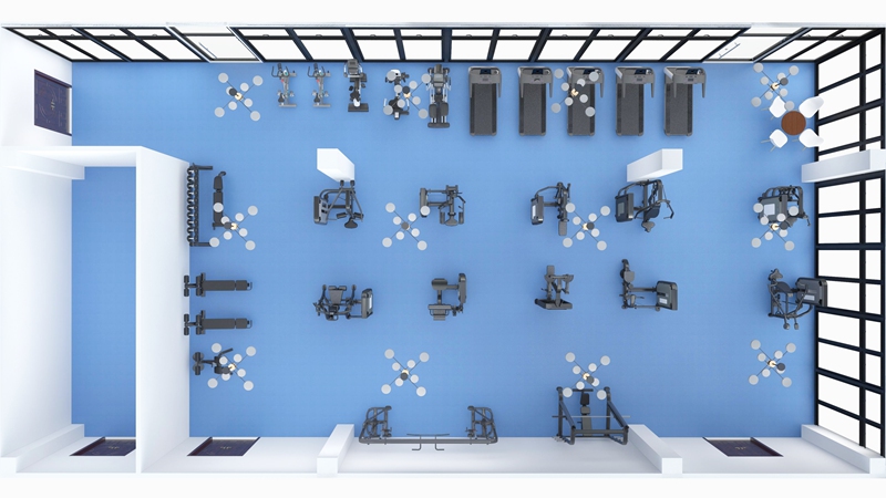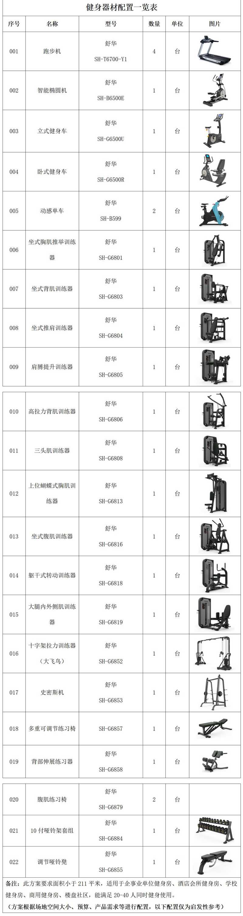 此方案要求面积小于211平米,适用于企事业单位健身房、酒店会所健身房、学校健身房、商用健身房、楼盘社区,能满足20-40人同时健身使用。(方案根据场地空间大小、预算、产品需求等进行配置,以下配置仅为启发性参考)