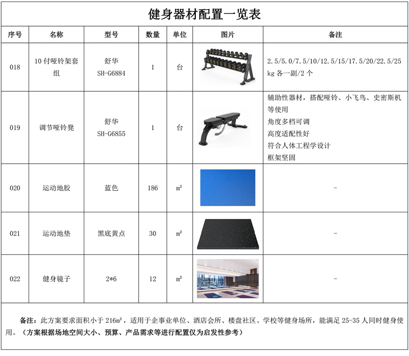 此方案要求面积小于216m²,适用于企事业单位、酒店会所、楼盘社区、学校等健身场所,能满足25-35人同时健身使用。(方案根据场地空间大小、预算、产品需求等进行配置仅为启发性参考)