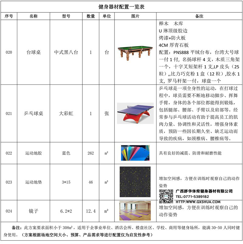 此方案要求面积小于308m²,适用于企事业单位、酒店会所、楼盘社区、学校、商用等健身场所,能满30-50人同时健身使用。(方案根据场地空间大小、预算、产品需求等进行配置仅为启发性参考)