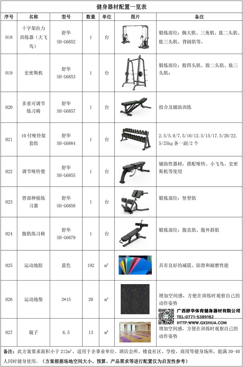 此方案要求面积小于212m²,适用于企事业单位、酒店会所、楼盘社区、学校、商用等健身场所,能满30-40人同时健身使用。(方案根据场地空间大小、预算、产品需求等进行配置仅为启发性参考)