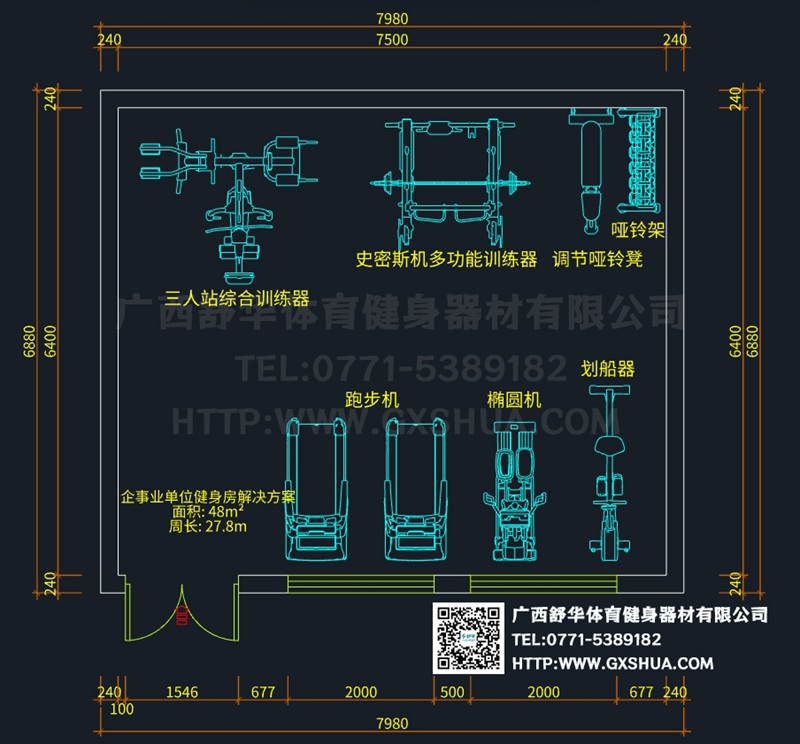企事业单位健身房是员工健康的守护站。久坐、长期面对电脑等工作模式容易引发各种健康问题,而健身房里的专业设备和训练空间,可以帮助员工预防和缓解诸如颈椎痛、腰椎间盘突出、肥胖等问题,提高身体的柔韧性、力量和耐力,保障员工以良好的身体状态为单位创造价值。基于这些独特功能,我们为这个48m² 的小型企事业单位健身房设计了如下配置方案。