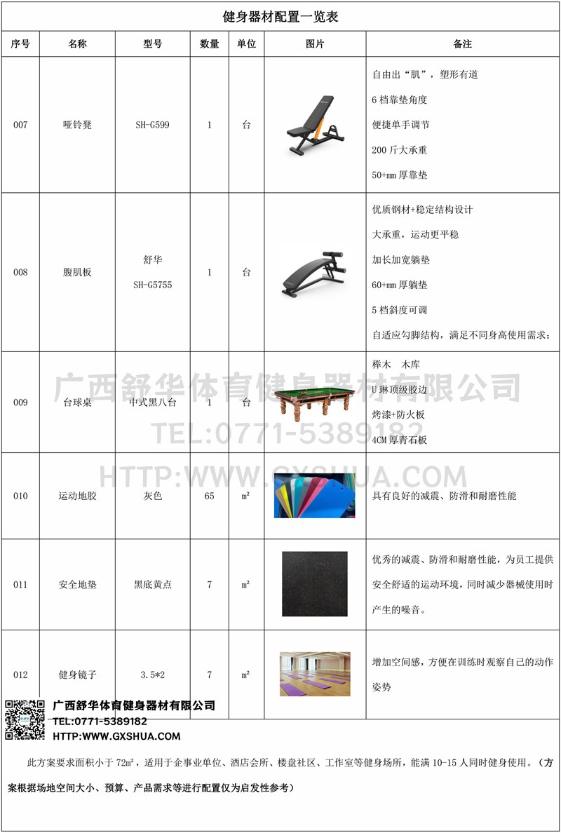 此方案要求面积小于72m²,适用于企事业单位、酒店会所、楼盘社区、工作室等健身场所,能满10-15人同时健身使用。(方案根据场地空间大小、预算、产品需求等进行配置仅为启发性参考)
