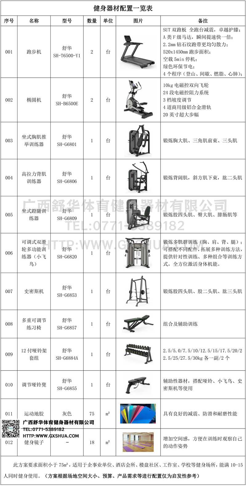 此方案要求面积小于75m²,适用于企事业单位、酒店会所、楼盘社区、工作室、学校等健身场所,能满10-15人同时健身使用。(方案根据场地空间大小、预算、产品需求等进行配置仅为启发性参考)