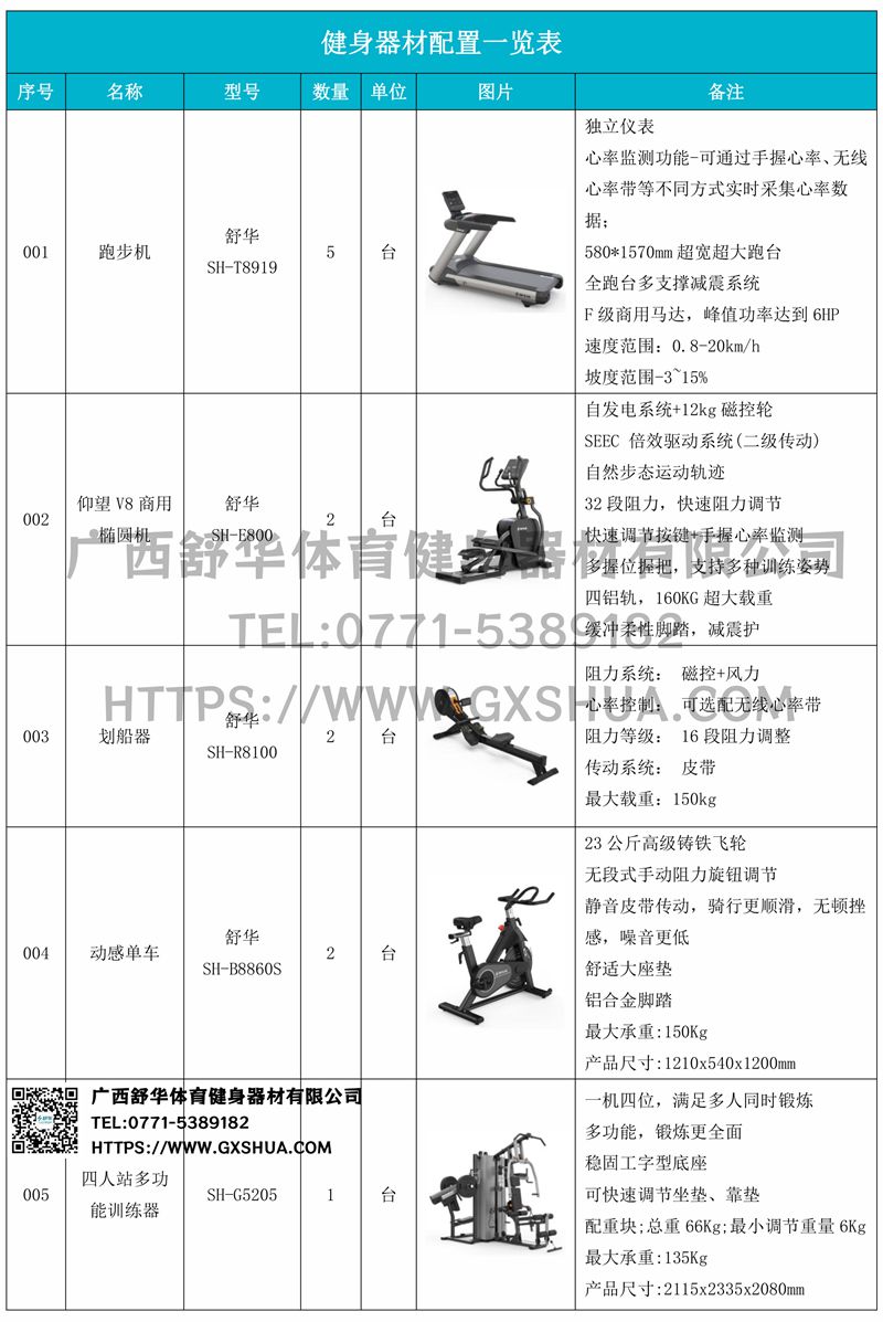 1.milantiyuV9跑步机SH-T8919*5台-580*1570mm超宽超大跑台-跑感舒适,跑台整体安全稳定;全跑台多支撑减震平台,保证跑台超强支撑力,达到180kg支撑,满足专业健身房需求。F级商用马达-超强马达,AC 3.0HP 交流,峰值功率达到6HP,F级商用品质。速度范围达到0.8-20km/h;V9跑步机可实现跑台扬升功能,坡度范围-3~15%,满足客户不同的锻炼需求。