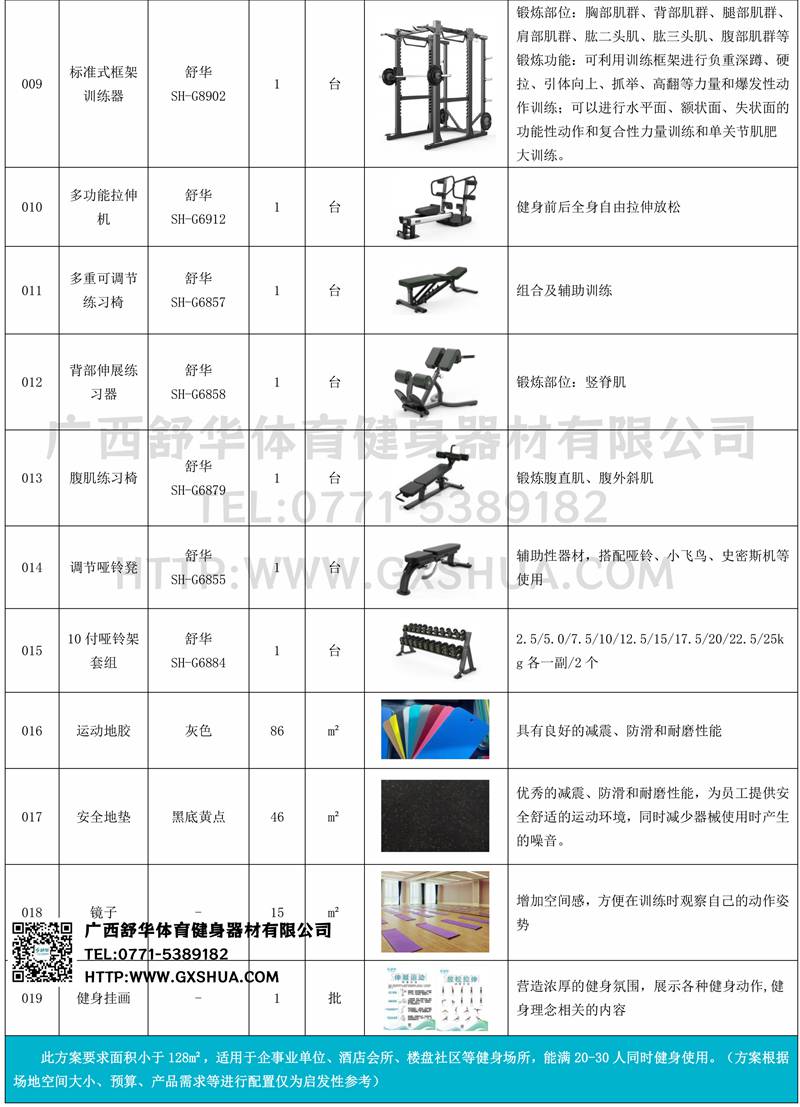 此方案要求面积小于132m²,适用于企事业单位、酒店会所、楼盘社区、学校等健身场所,能满20-30人同时健身使用。(方案根据场地空间大小、预算、产品需求等进行配置仅为启发性参考)