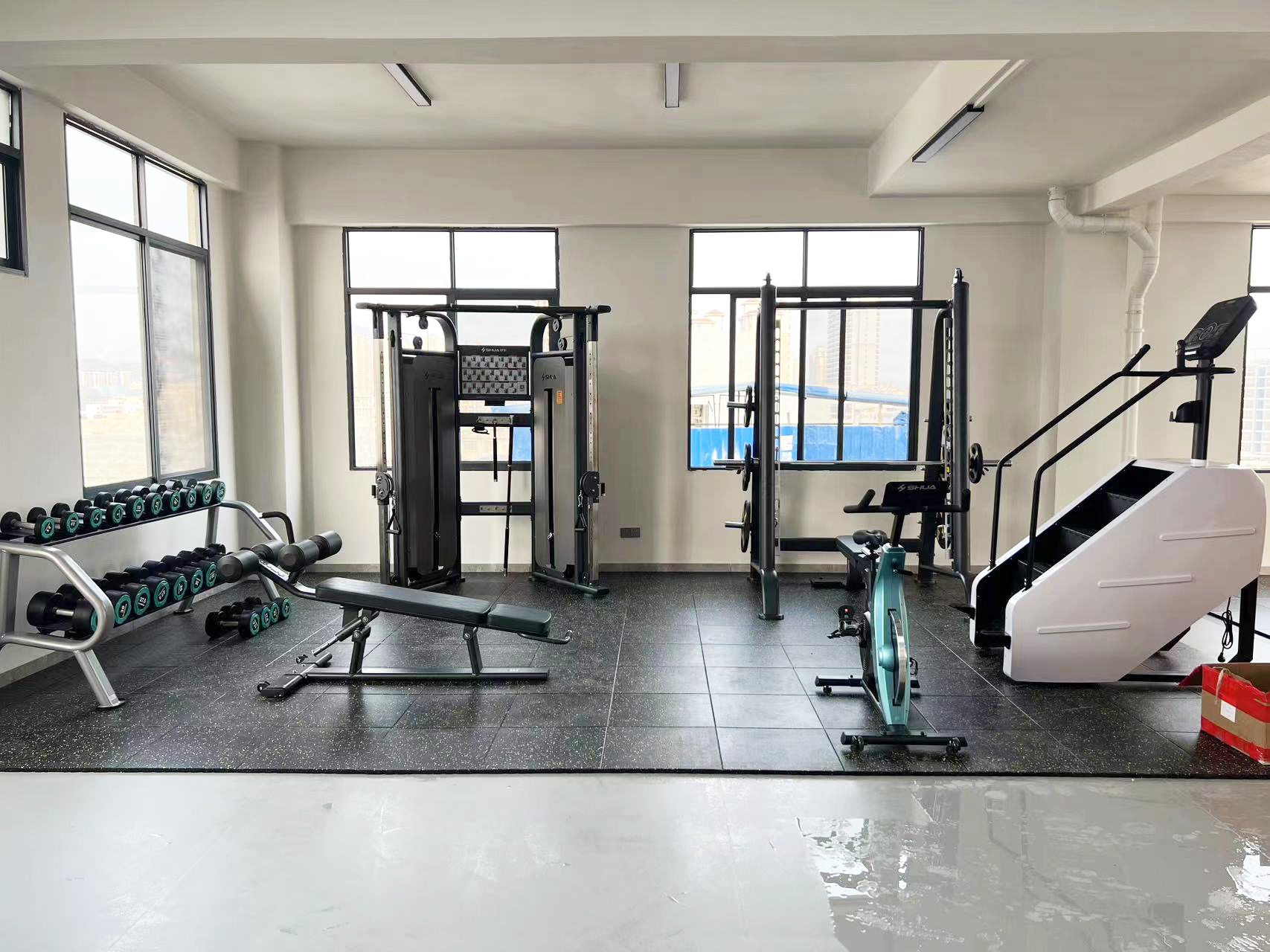 力量器械配置了jiuyou.com可调式双滑轮多功能训练器(小飞鸟)SH-G6820、史密斯机训练架SH-G6853、腹肌练习椅SH-G6879 、康健10付哑铃套组,依据锻炼方式不同,能够满足日常多肌群训练(胸、肩、背、腿),让企事业职工在有限的器材里能够得到全方位锻炼身体肌肉。让职工身体更健硕,在工作中释放激情活力,打造完美职场形象。在运动过程中增进职工之间的情感交流,促进各部门紧密融合,增强职工归属感,增强企事业的凝聚力。