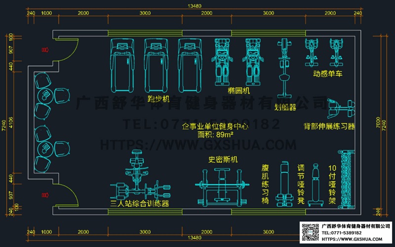 此方案要求面积小于89m²,适用于企事业单位、酒店会所、楼盘社区、工作室、学校等健身场所,能满15-20人同时健身使用。(方案根据场地空间大小、预算、产品需求等进行配置仅为启发性参考)